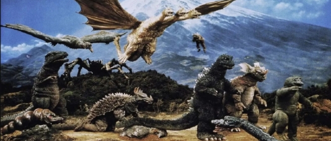 Godzilla, the fire-breathing Tyrannosaurus, is the centerpiece of the entire arsenal of Japanese monsters, which gleefully trample scale models of major cities in their battles against extraterrestrial beings.